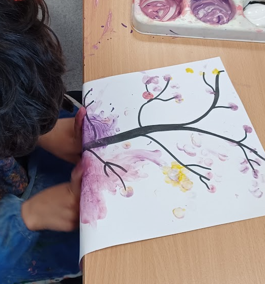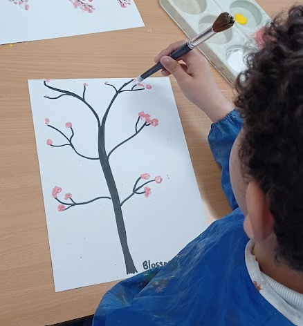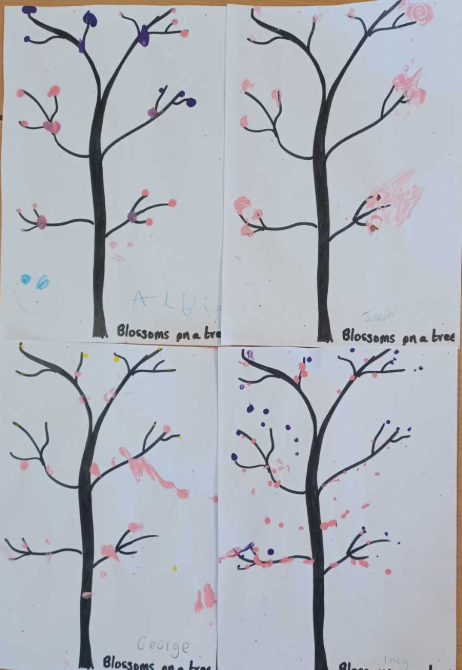 Art: The children enjoyed painting blossoms on trees for Spring. They chose their colours carefully to dot paint the blossom to create their trees.
