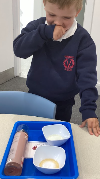 Last week in science, Gems participated in a practical activity to support their learning the names of the 5 senses and what body parts help us explore our senses.