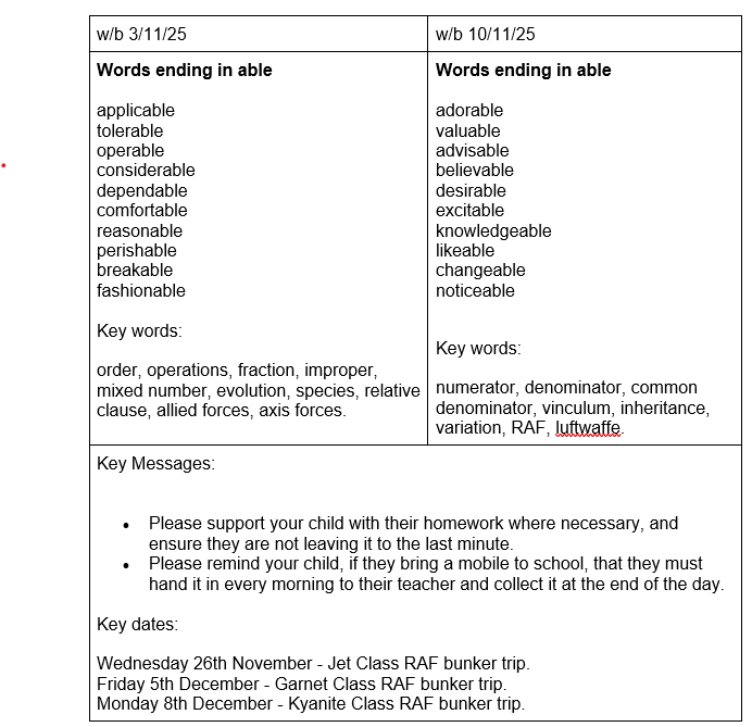 Key Messages: 11th November - Anti-bullying Workshop 14th November - Odd Socks Day 21st November - Nasal Flu Vaccination 24th November - Moonstone Class Assembly 9am 25th November - Peridot Class Assembly 9am 26th November - Starlite Class Assembly 9am