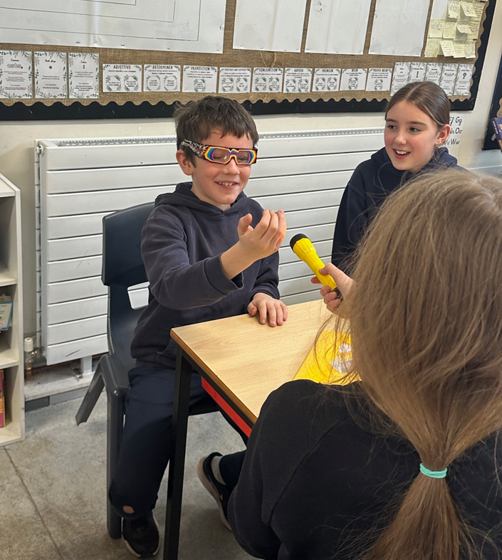 We’ve been enjoying hands-on investigations into refraction and colour. The children loved experimenting with light and exploring how it can bend, split and create different effects. Have you ever put a pencil in a glass of water and thought about what is happening or thought about how a rainbow is formed? Ask your children to explain these to you.